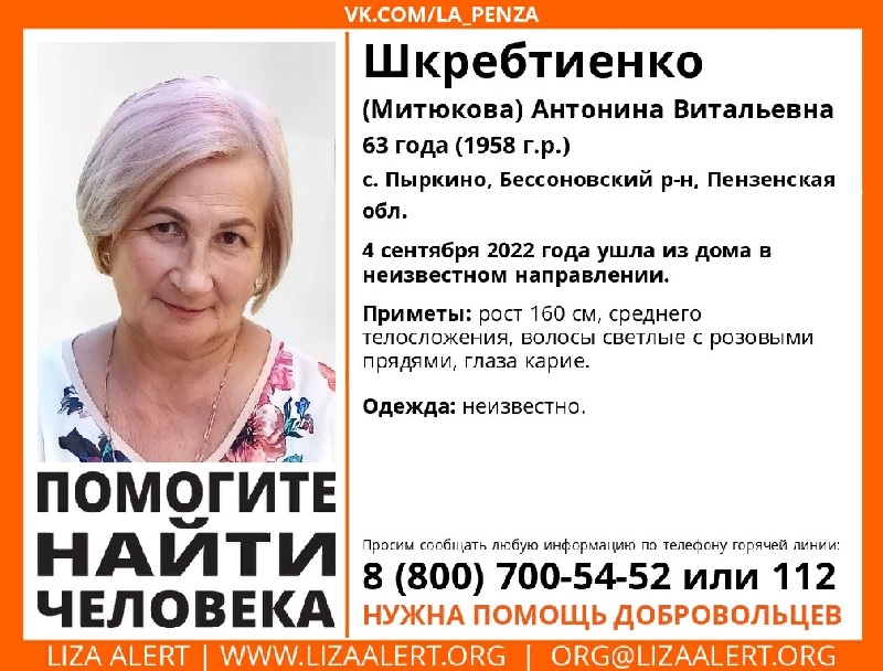 Антонина Шкребтиенко проживает в селе Пыркино Бессоновского района. Она ушла из дома 4 сентября, никому не сообщив, куда направляется.