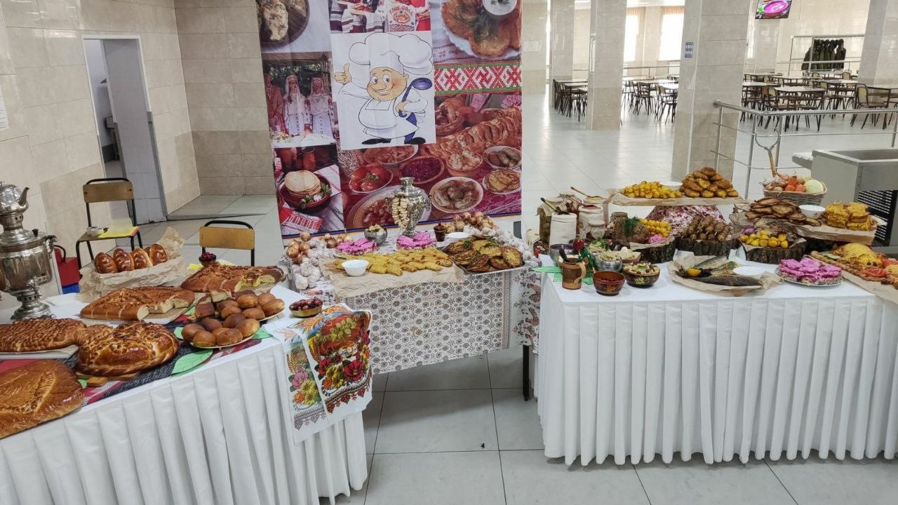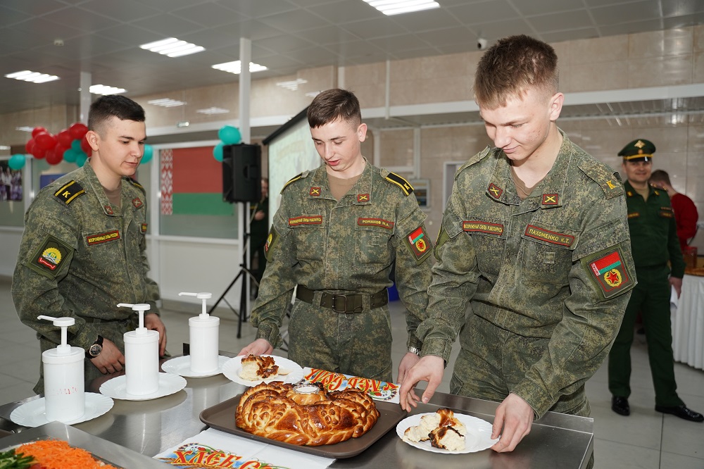 На выставочном столе курсантов ждал особый сюрприз. Повара приготовили множество вкусностей, включая блюда белорусской кухни: блинчики с начинкой, пироги, пирожки, драники, вареники, галушки, селедку под шубой. Украшением стола стала фигура поросенка из картофельного пюре, фаршированная мясом.