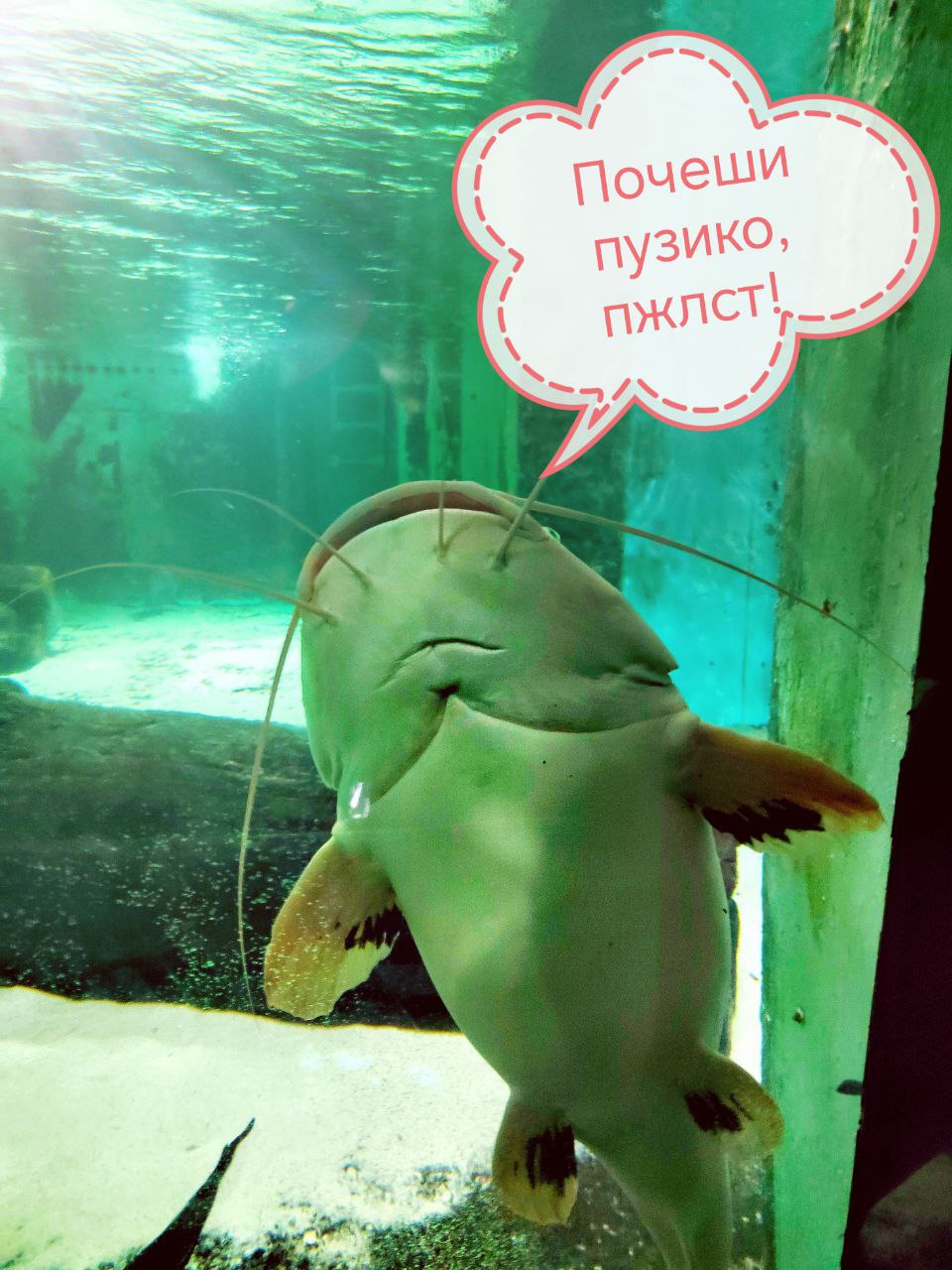Львиную часть времени сом проводит у стенки своего аквариума, так что посетителям открывается дивный вид на его пузико.
