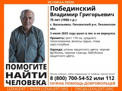 Поисковый отряд «Лиза Алерт» сообщает о начале поисков 75-летнего Владимира Побединского, который пропал 3 июля в селе Васильевка Пензенского района. По имеющимся данным, мужчина ушел в лес и до настоящего времени не вернулся.