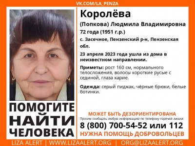 Пензенцев призвали помочь в поисках 72-летней Людмилы Королевой (Попковой). Новую ориентировку на розыск опубликовали волонтеры из поискового отряда «Лиза Алерт».