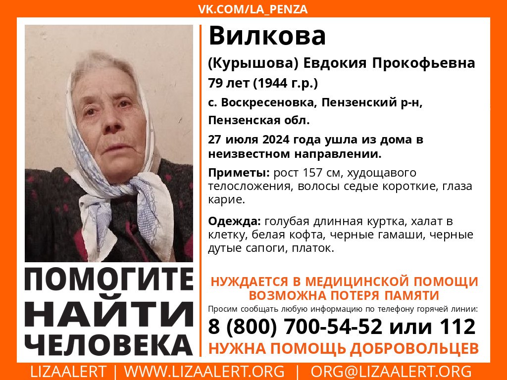 79-летняя Евдокия Вилкова (Курышова) пропала в селе Воскресеновка Пензенского района 27 июля.