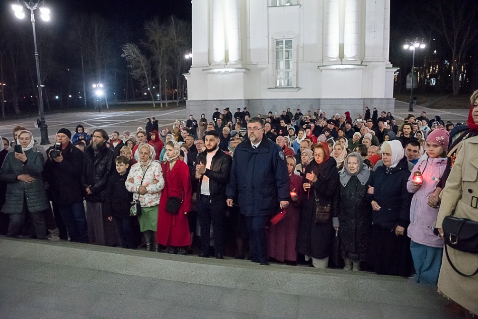 После этого к молящимся обратился глава региона Олег Мельниченко: «Пасха — праздник, который знаменует собой победу жизни над смертью, добра над злом, это праздник любви и прощения. Я хочу в этот день пожелать всего самого доброго вам и вашим семьям — мира, добра и хорошего настроения. Мы живем в непростые времена. Вы видите, какие гонения идут на Православную Церковь. Но, думаю, как и в эпоху раннего христианства, они приведут только к сплочению верующих и в конечном итоге — к нашей Победе. С праздником Светлой Пасхи!».