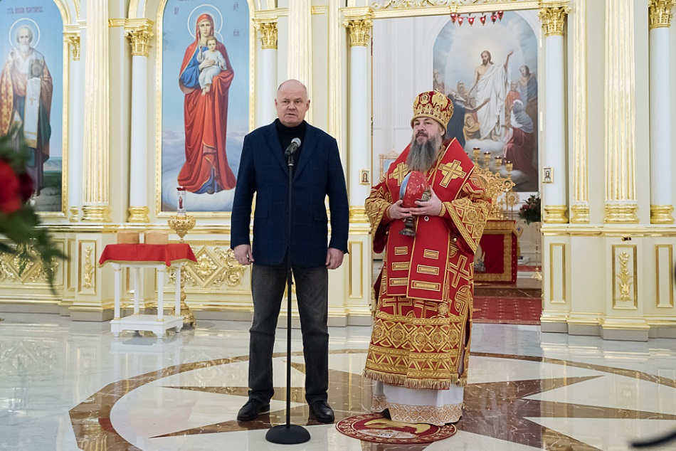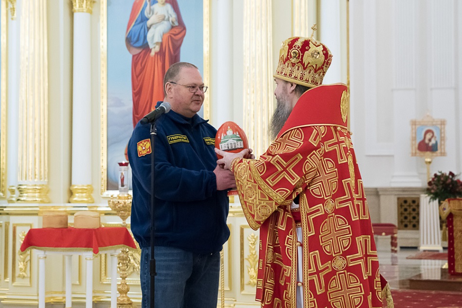 Затем митрополит Серафим приветствовал Олега Владимировича Мельниченко и преподнес представителям власти на память о Светлом Христовом Воскресении сувенирные пасхальные яйца.
