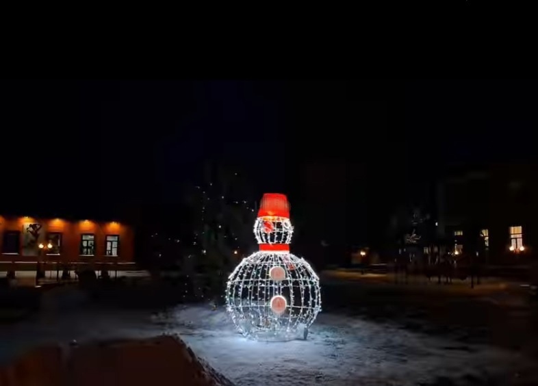 В преддверии Нового года в общественном пространстве появился светящийся снеговик, судя по всему, его можно увидеть возле украшенной праздничной елки.