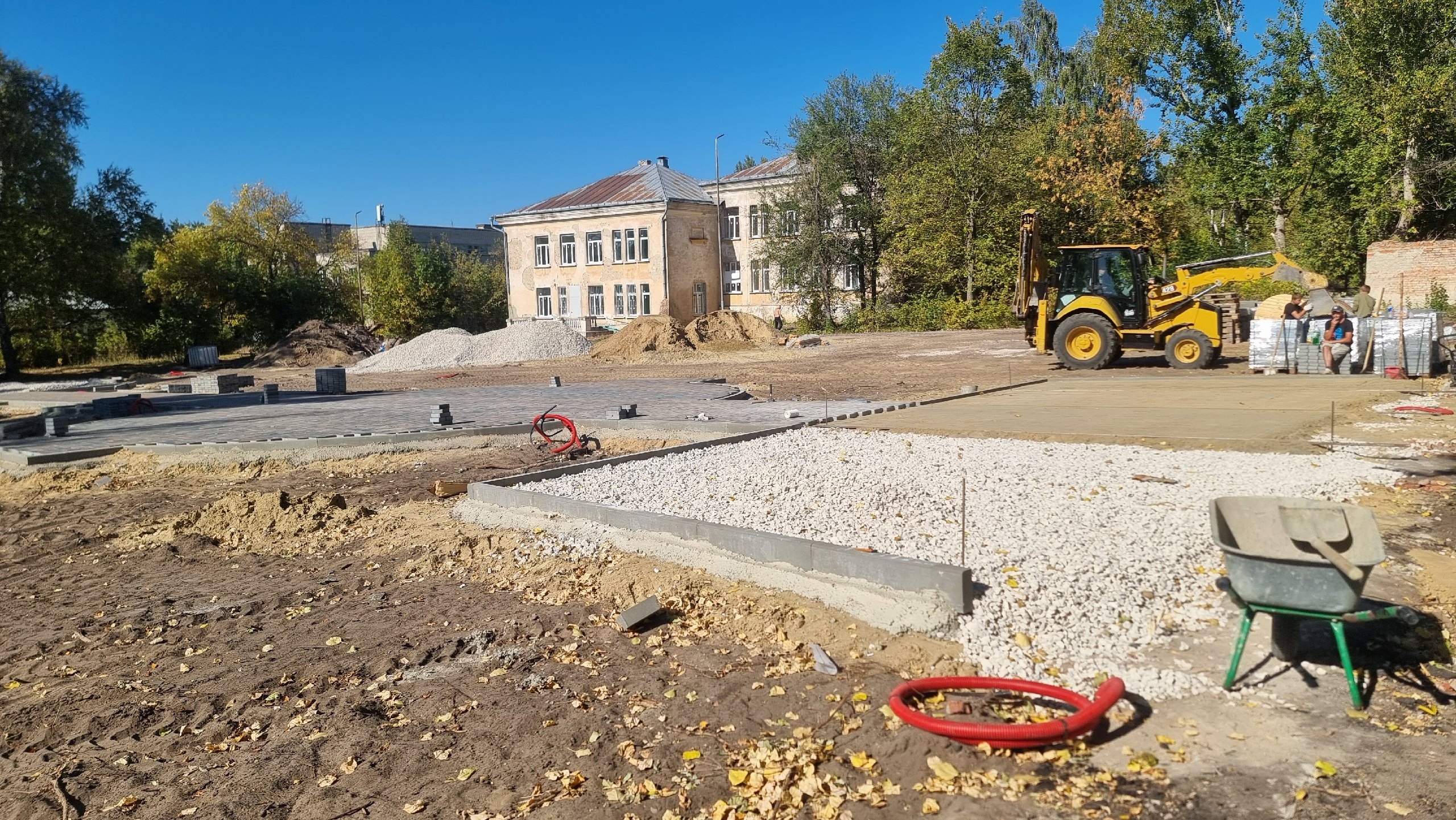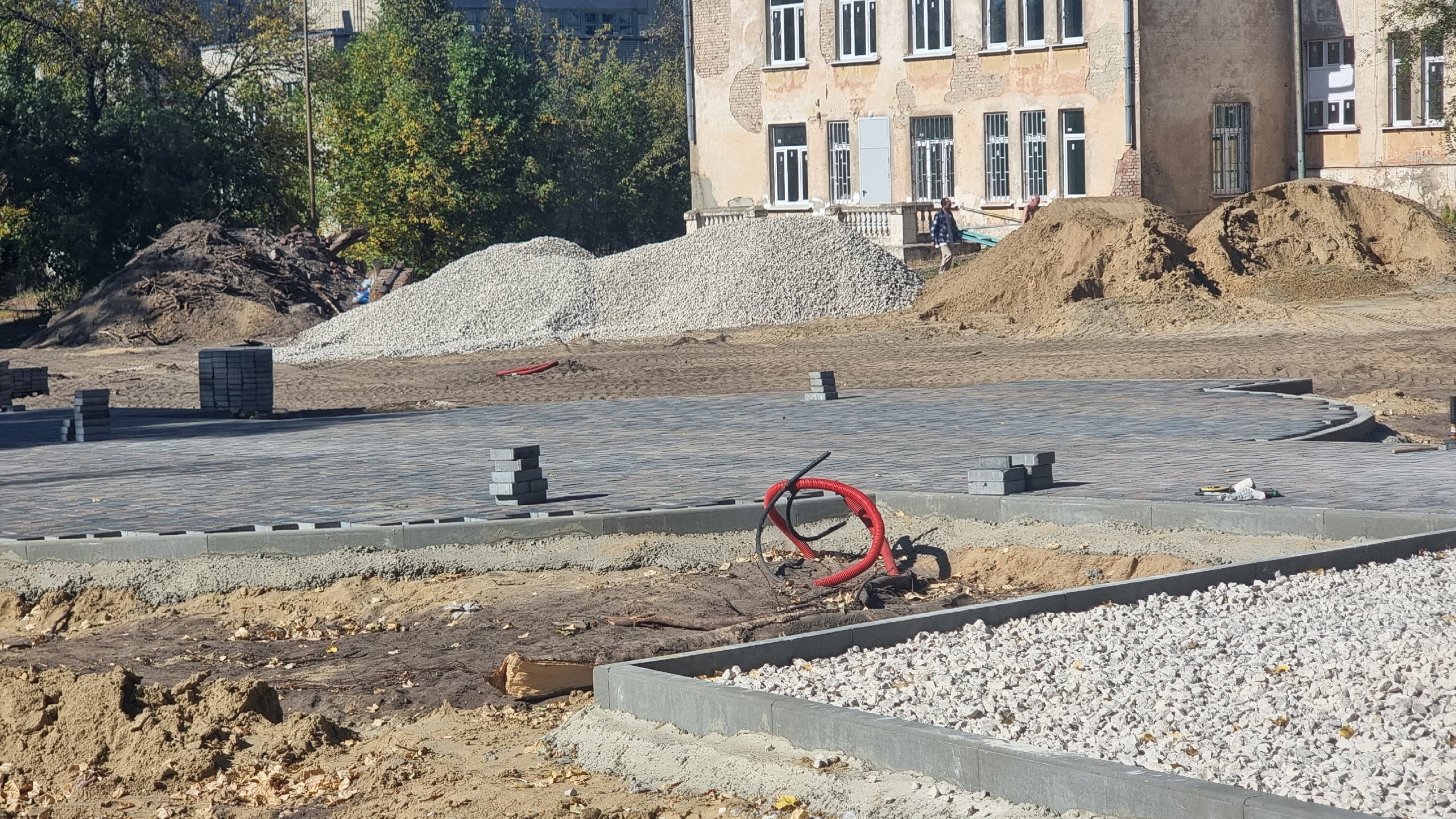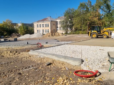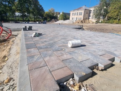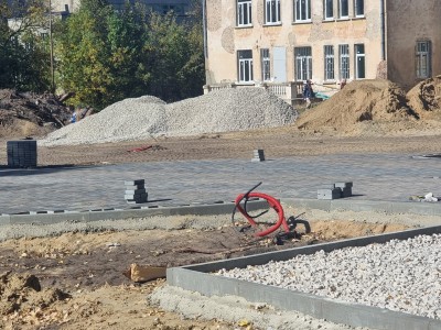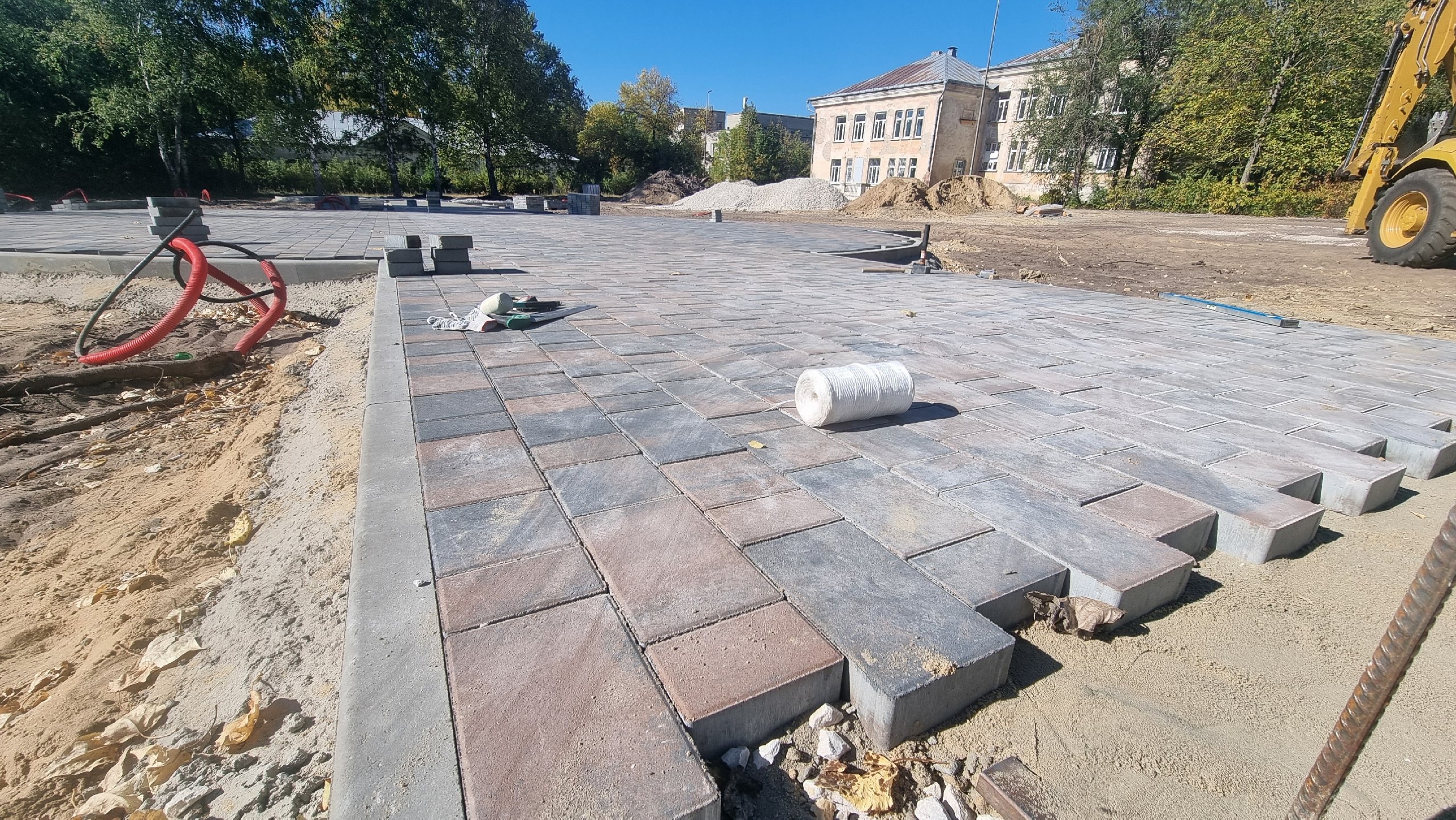 На данный момент подрядная организация занимается укладкой тротуарной плитки, а также установкой наружного освещения.