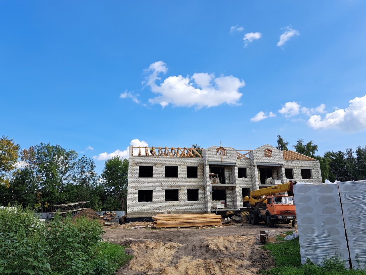 По словам градоначальницы, на данный момент строители завершают монтаж стропильной системы двускатной крыши.