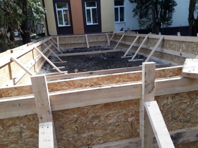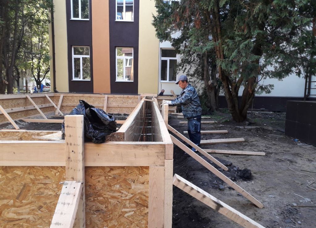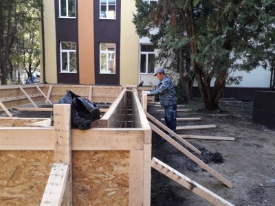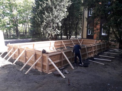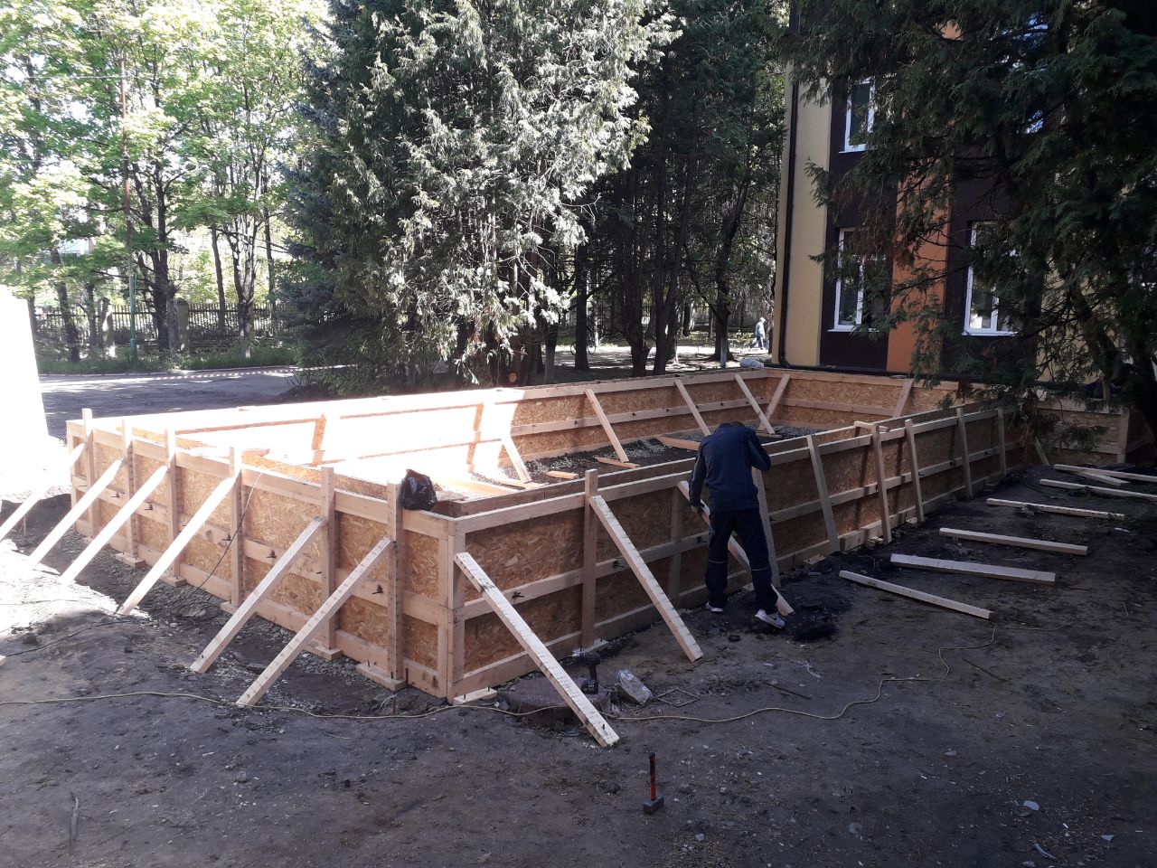 В настоящее время завершены земляные работы, также проведена установка гравийной подушки. Строители провели вязку арматуры и соорудили опалубку под ленточный фундамент. В скором времени рабочие приступят к заливке бетона.