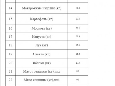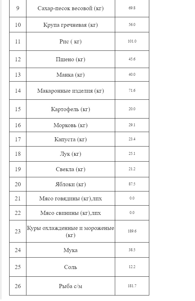 При этом цены снизились на морковь – на 7,7%, поваренную соль – 2%, яблоки – 1,9%, пшеничную муку 1,5%, макароны 1,2%, сахарный песок – 0,9%, питьевое пастеризованное молоко – 0,8%, вермишель – 0,8% и сливочное масло – 0,7%.
