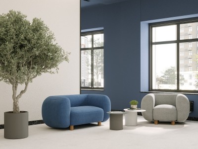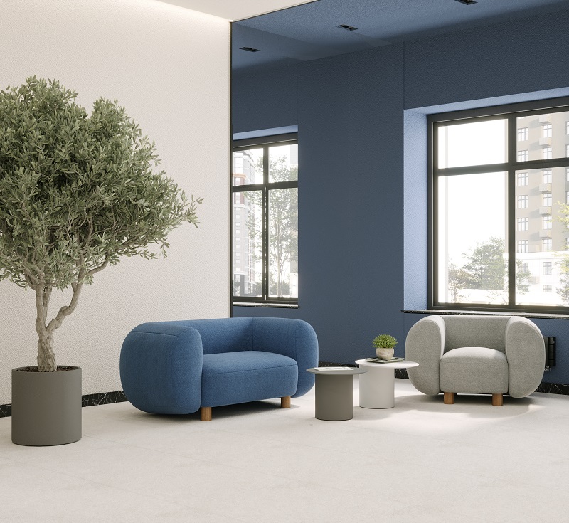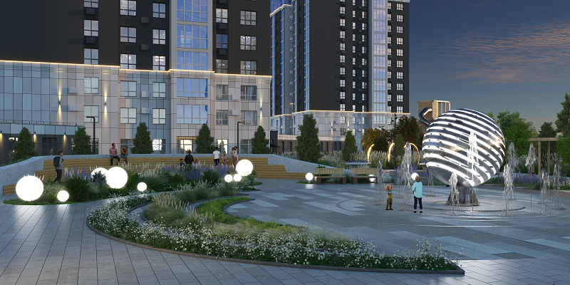 Этот двор – без машин, с собственным фонтаном и необычными арт-объектами. Холл – традиционно функциональный, с мягкими зонами ожидания, лапомойкой и колясочной.