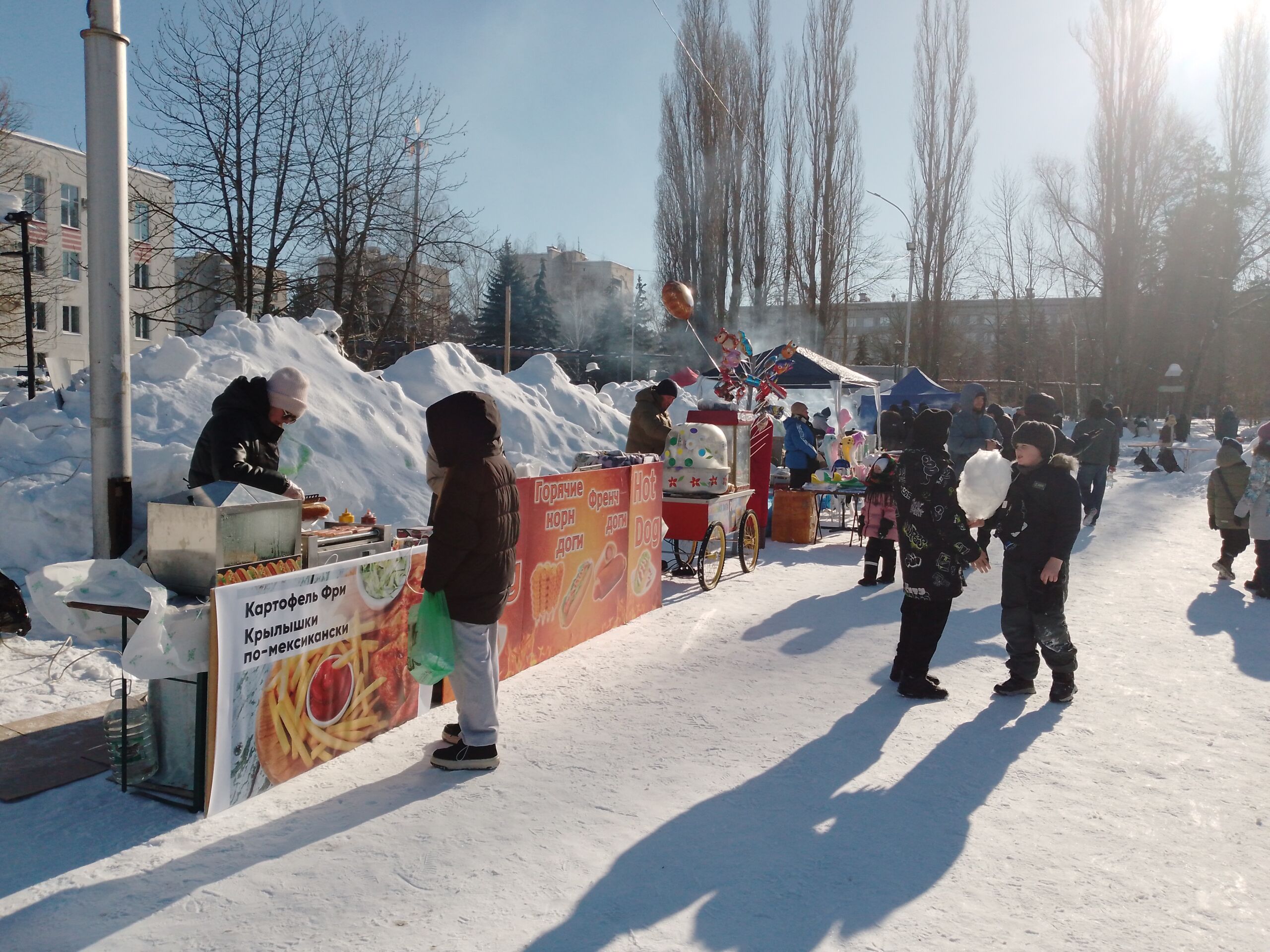 Празднование началось еще в 10:00 с открытия торговых рядов, где жители и гости города могут угоститься ароматными шашлыками, горячим чаем, блинами и сладостями.