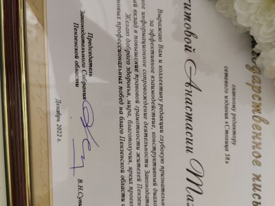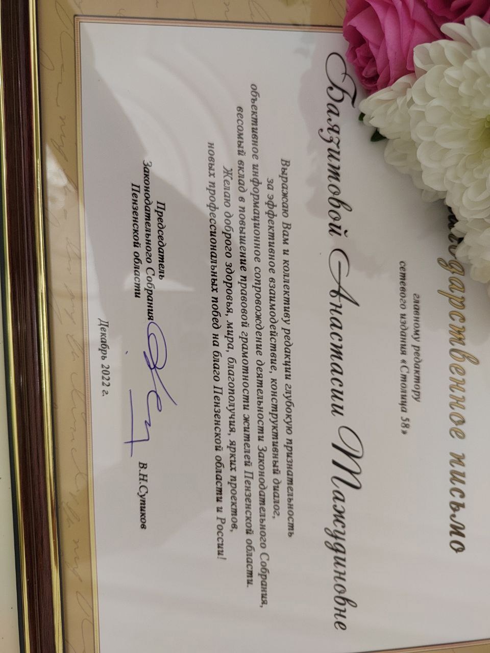Главный редактор информационно-аналитического издания «Столицы 58» Анастасия Баязитова была удостоена благодарственного письма от председателя областного Законодательного Собрания Вадима Супикова.