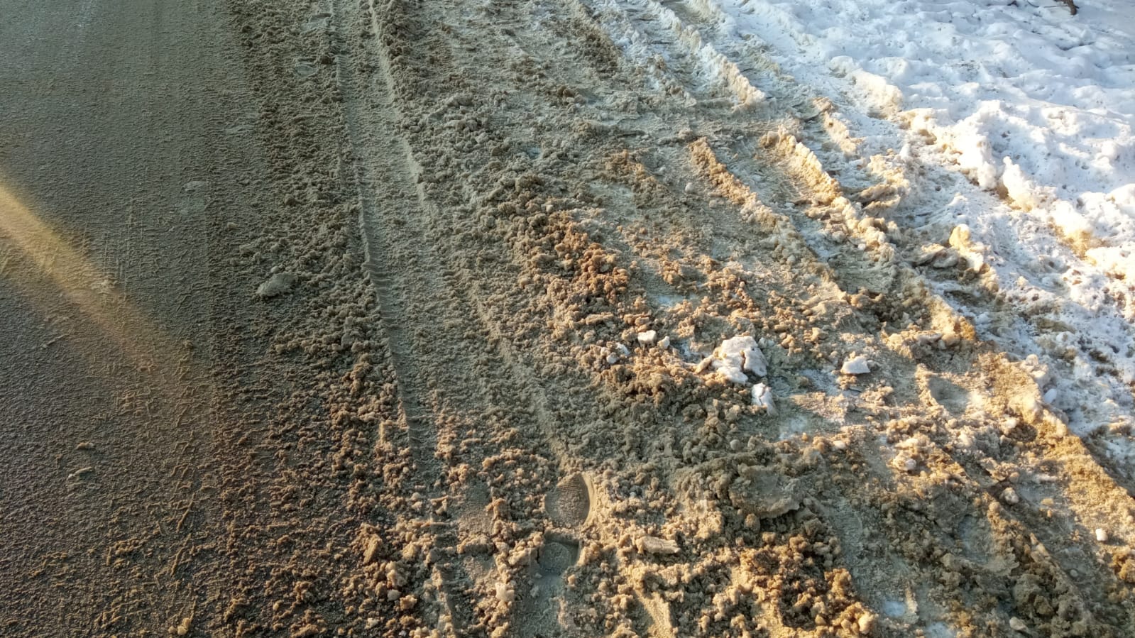 Тротуары на дороге между 2-ым Военным гоодком и поселком Монтажный не расчищены. Поэтому детям приходится ежедневно ходить в школу по проезжей части.