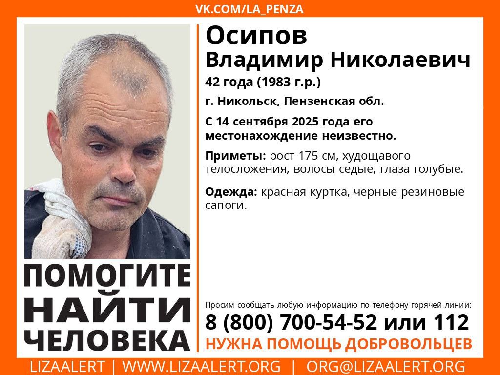 В Пензенской области разыскивается 42-летний Владимир Николаевич Осипов, житель города Никольск. С 14 сентября 2025 года его местонахождение неизвестно.