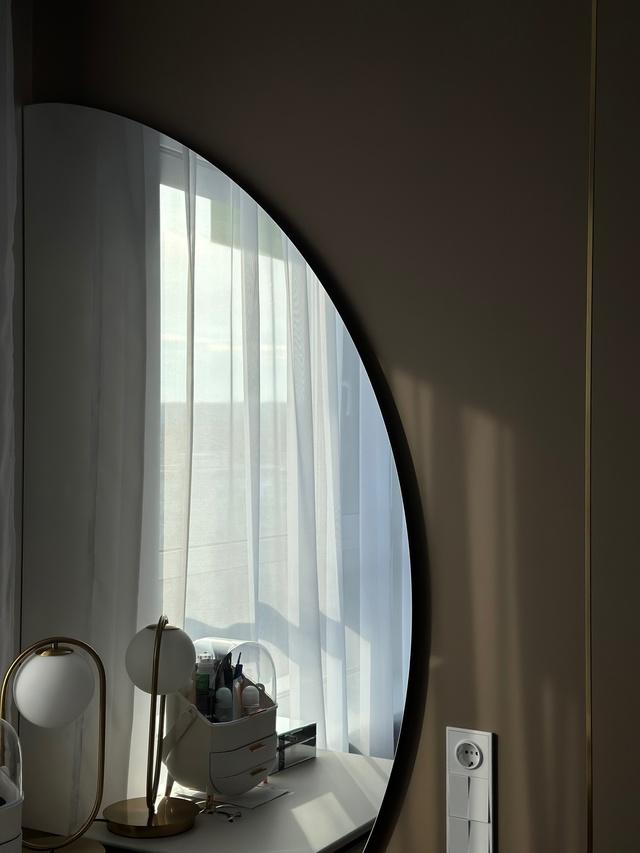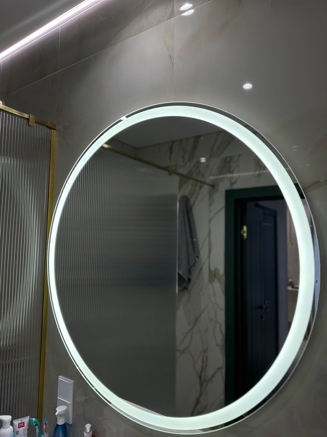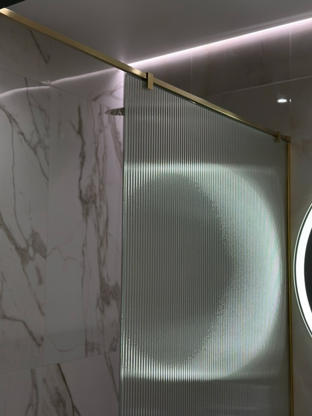 В спальне элегантное зеркало, изготовленное на заводе, гармонично вписалось в общий стиль, добавив комнате света и простора. Ванную комнату преобразило душевое ограждение из рифленого стекла — практичное и одновременно изысканное решение, обеспечивающее приватность и визуально расширяющее пространство.