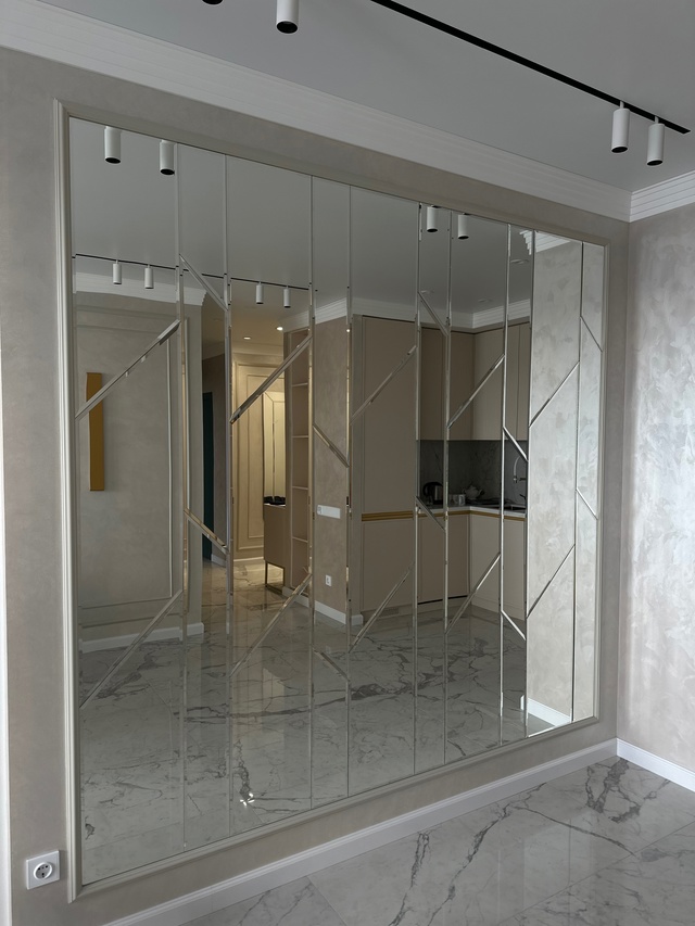 Особого внимания заслуживает зеркальное панно в обеденной зоне. Этот эффектный элемент декора привнес в интерьер нотки утонченности и изысканности, став настоящей изюминкой пространства. Игра света и отражений создает неповторимую атмосферу и визуально увеличивает помещение.