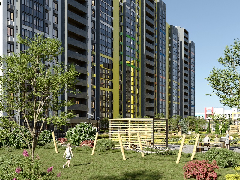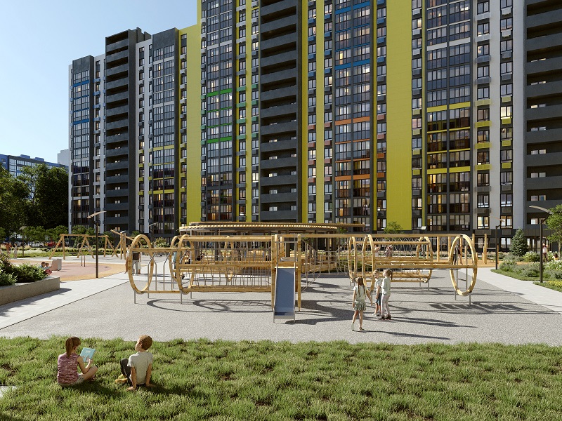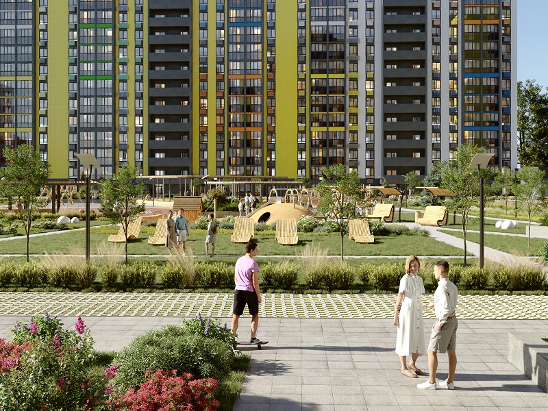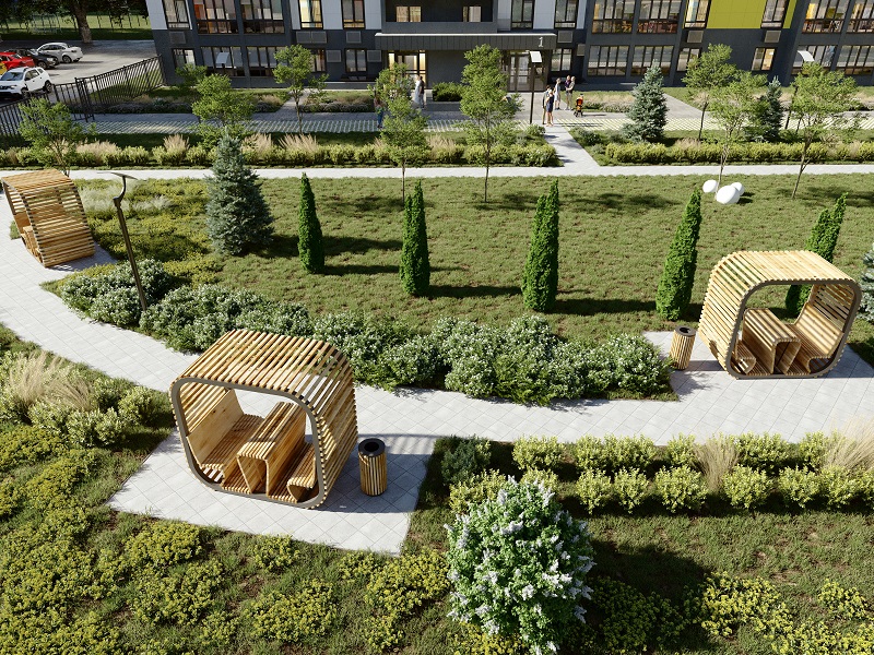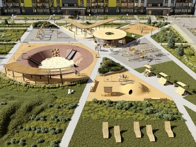 Здесь интересная песочница с геопластикой, игровые комплексы, беседки, перголы. Есть и барбекю-зона, где можно будет устраивать семейные пикники по выходным.