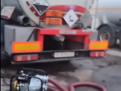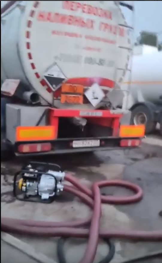 На записи можно увидеть большегруз, у цистерны которого открыт люк. Из него идут шланги, которые тянутся по земле в другие цистерны.