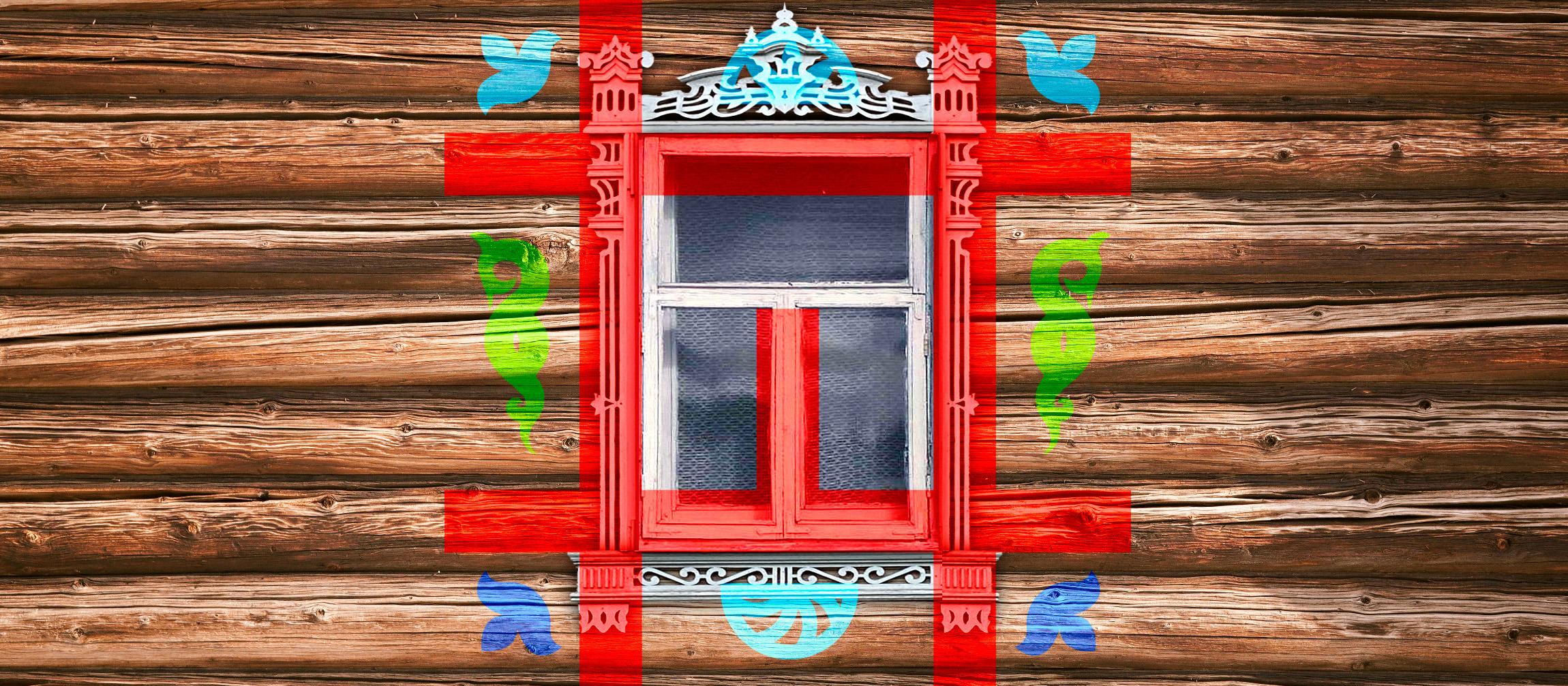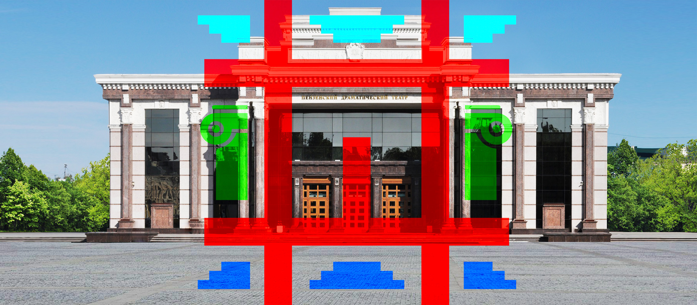 На сайте студии опубликованы референсы, на основе которых было создано новое лого: за основу взяли пензенский драмтеатр и почему-то наличник. В результате получилась белая решетка на красном фоне с зелеными и голубыми квадратами. Видимо, решетка должна символизировать тот самый наличник, голубые квадраты – реку Суру, а зеленые – леса.