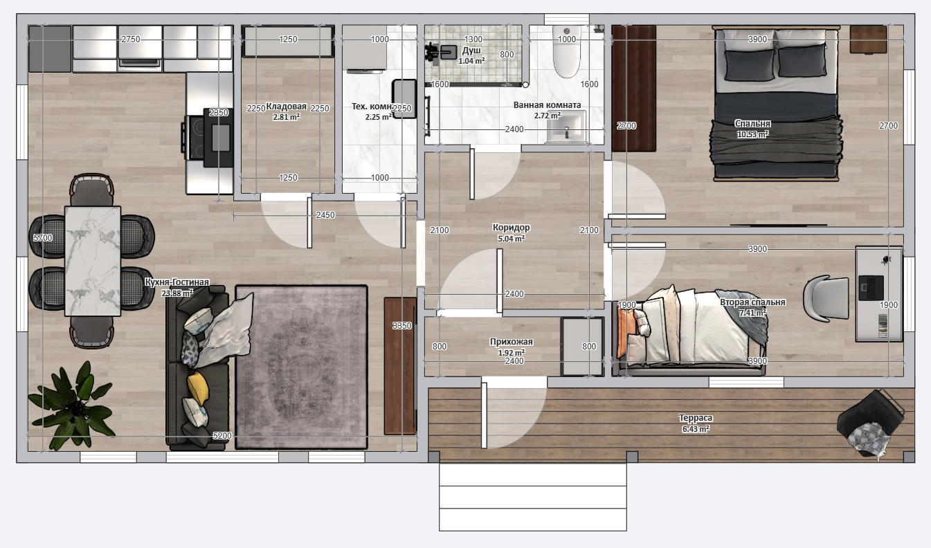 Благодаря открытой планировке кухни-гостиной и панорамному остеклению, внутри дом ощущается гораздо просторнее, чем аналогичная по площади квартира. Мы не строим лишние коридоры — мы строим полезные метры.