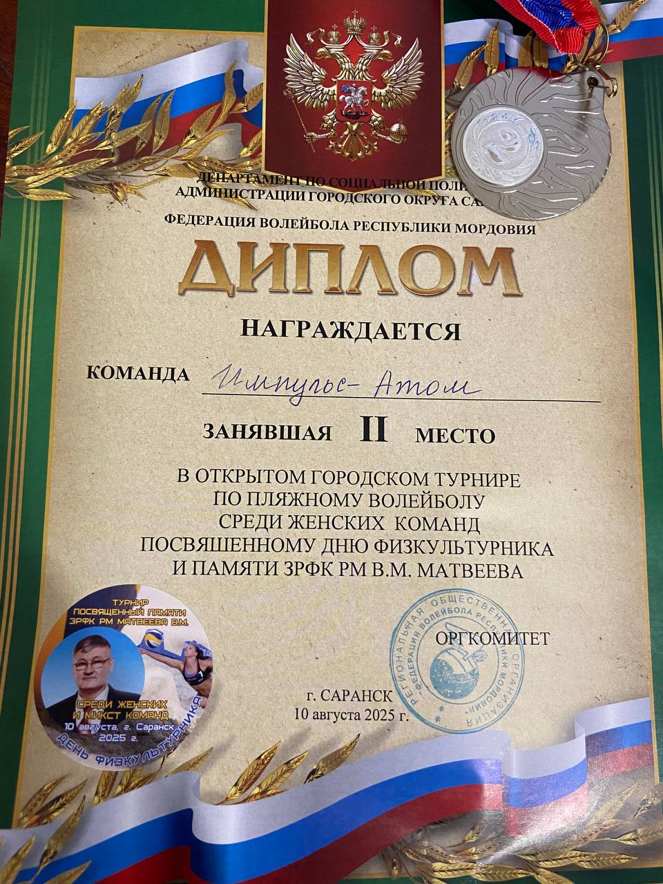 Пензенская волейбольная команда "Импульс-Атом" завоевала второе место на турнире по пляжному волейболу, посвященному Дню физкультурника. Соревнования прошли в Саранске с участием команд из Москвы, Санкт-Петербурга и других регионов. Пензенскую область, помимо "Импульса-Атом", представляла также команда из Заречного.