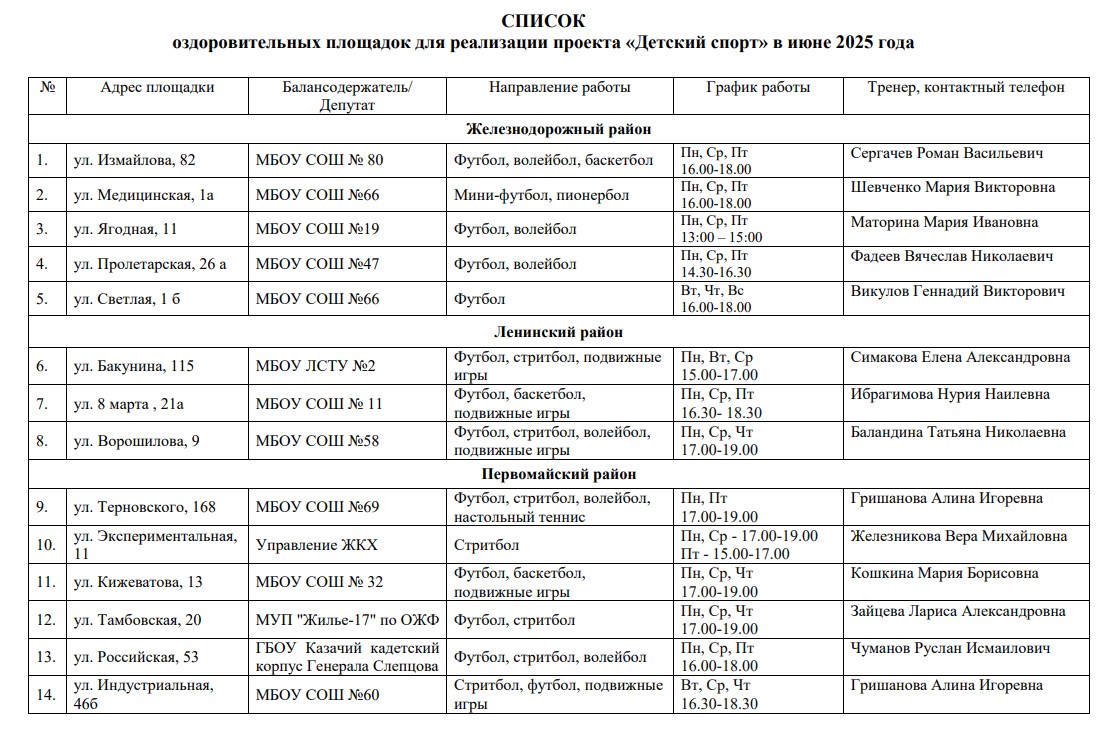Мэр Пензы Олег Денисов сообщил в своем телеграм-канале о начале работы дворовых тренеров. С начала лета спортивные занятия для детей проводятся на 20 площадках города, включая дворовые и пришкольные территории. Ребята могут заниматься футболом, волейболом, стритболом и другими подвижными играми, а также участвовать в командных соревнованиях.